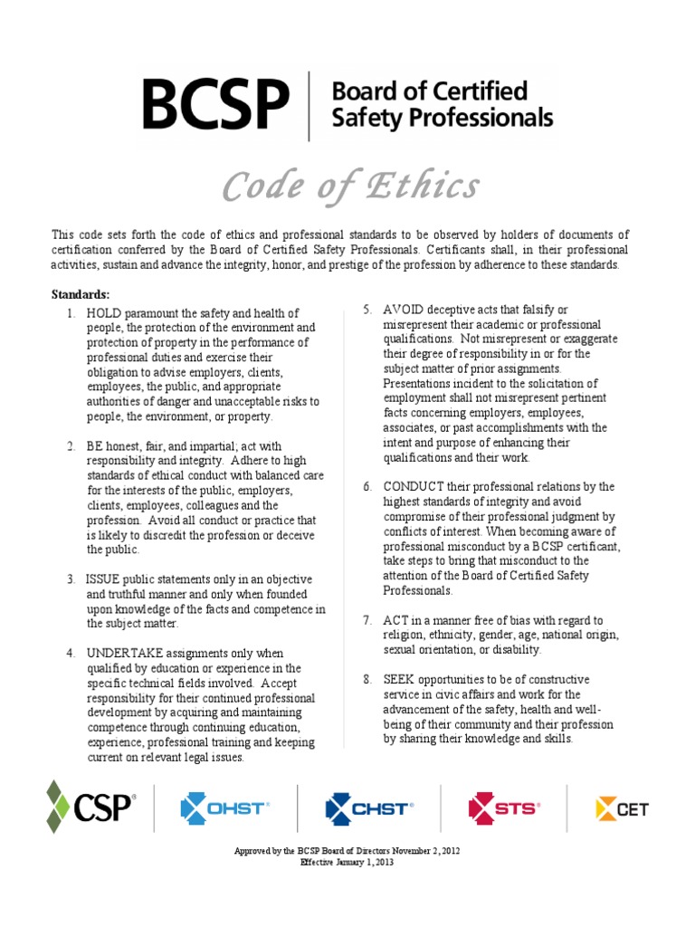 The naeyc code of ethical conduct offers guidelines for responsible behavior and sets forth a common basis for resolving the principal ethical dilemmas encountered in early childhood care and education. Overview the programme has been successfully structured and prepared to illustrate how bem code of ethics/regulations. Code of ethics and standards of professional conduct. This code of ethics sets out general principles of ethical conduct to be observed by members, licensees, interns, and holders of certificates of authorization (each, a practitioner). Code of ethical conduct and statement of commitment. Nspe code of ethics for engineers download: This code of ethics and professional conduct downloaded from betterteam. 15.1 professionalism the concept of professionalism the expression of the ideals by which our profession. This statement of values and code of ethics recognizes the complexity of our roles, including the full spectrum of personal, professional and cultural diversity in members of the international association of facilitators are committed to using these values and ethics to guide their professional practice. Code of ethics and disciplin ing th ose who make the wrong choices. Forward ethics and the engineer in the practice of engineering, most engineers, no matter whether they are employees or private practitioners, or whether they are in public or private enterprise, find that in their professional lives. Bem mandatory course on code of ethics/regulations organized by: Our second article, implementing an organizational code of ethics, examines perhaps the most critical variable in code effectiveness: