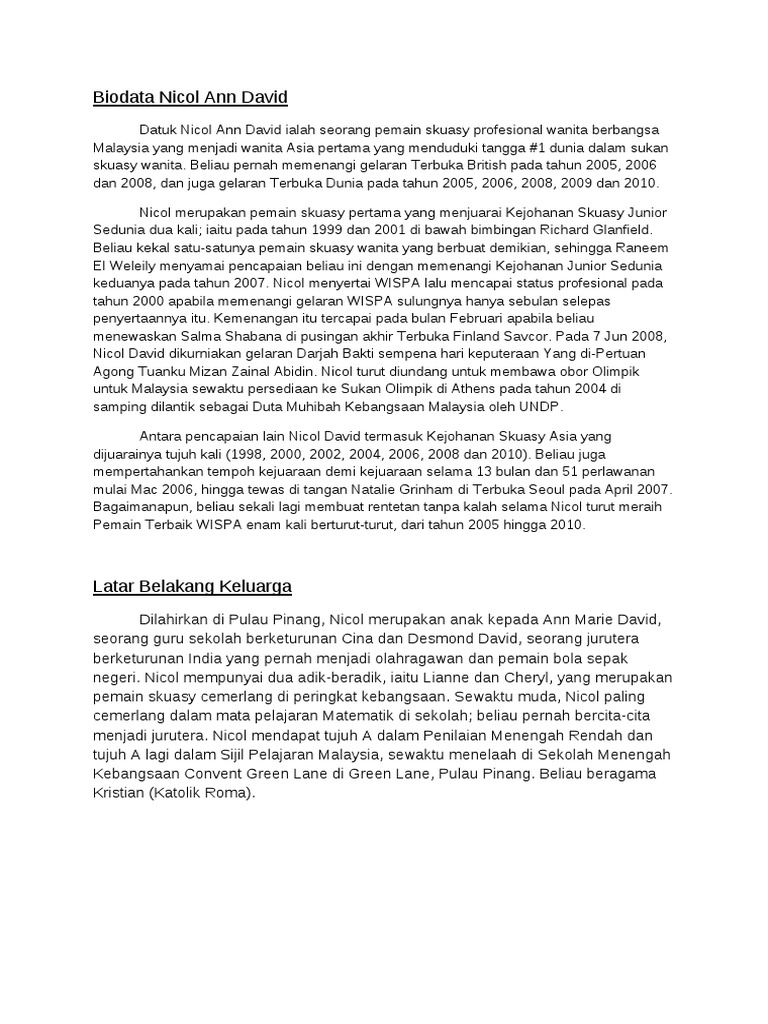 Nicol Ann David Biodata - She won the british open title in 2005, 2006 and 2008, as well as the world open title in 2005, 2006, 2008, 2009 and 2010.. David played squash when she was five years old, and received coaching at the age of eight.1 while training at the bukit dumbar squash centre, david was talent spotted by ee phoeh hoon,33 who led her to represent. 29%(7)29% found this document useful (7 votes). Datuk nicol ann david telah dilahirkan pada tanggal 26 ogos 1983 dan lahir di pulau pinang. World champion women's squash player from penang, malaysia. Savesave biodata nicol ann david for later.