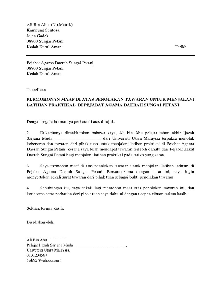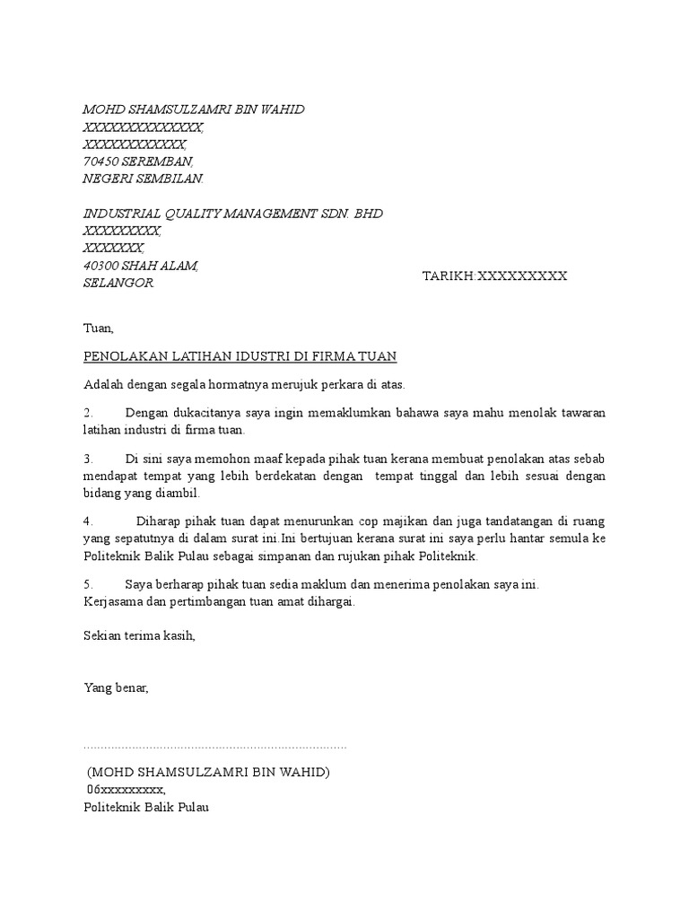 Contoh Surat Menolak Tawaran Kerja Download Kumpulan Gambar from i.pinimg.com So saya buatlh surat sendiri tapi kena. Pegawai perhubungan & latihan industri). Bagaimana saya hendak tahu permohonan saya diterima atau tidak. Latar belakang ppd muar tujuan penubuhan ppd muar latihan industri pada tahun 1980, dibangunan yang sama kementerian pendidikan malaysia telah menaik taraf bangunan pejabat pendidikan daerah muar. Buat surat penolakan jika anda tak mahu tempat itu dan beri salinan kepada penyelaras latihan industri. Surat]slip pengesahan tamat latihan industri; Contoh surat penolakan by universitas neger. Skop tugasan dh dapat dari fakulti.