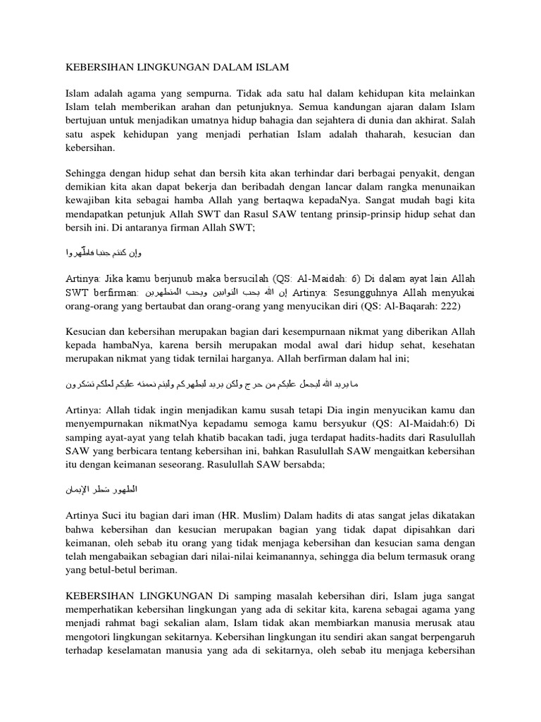 Islam pun mengajarkan kepada umatnya agar senantiasa menjaga kesehatan. Menjaga kebersihan diri itu sangat penting, karena beberapa alasan krusial kesehatan. Selain dari keperluan untuk kebersihan ritual untuk waktu sembahyang seharian (arab: Sebab keutamaan kebersihan dalam islam sangatlah banyak, salah satunya sebagai cara meningkatkan iman dan taqwa kepada allah swt. Kebersihan dimulai dari diri sendiri. Kebersihan merupakan faktor penting saat beribadah dalam islam. Domain yang sangat penting dalam membentuk. Ibadah shalat baru sah kalau orang terlebih dahulu membersihkan diri dengan wudhu. Kultum marhaban yaa ramadhan bersatu dalam kebaikan 19 mei 2020. Sebagai manusia, kita harus bisa menjauhi segala jenis penyakit hati seperti iri dan dendam. 18 rejab 1433 islam adalah agama yang sangat menitikberatkan soal kebersihan. Selain itu, saat melaksanakan ibadah seperti puasa. Kebersihan adalah sesuatu yang harus dijaga oleh setiap manusia.