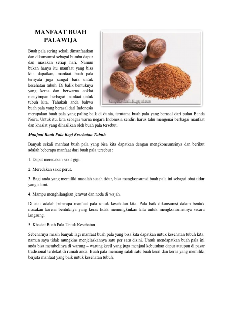 Berikut beberapa khasiat buah pala untuk kehidupan manusia: Berbagai jenis produk pala olahan juga mudah ditemukan. Buah pala memiliki berbagai manfaat bagi kesehatan tubuh. Buah pala merupakan obat tradisional yang memiliki banyak khasiat. Pala memiliki khasiat luar biasa terhadap kesehatan mulut terutama untuk masalah bau mulut. Es buah pala segarrrbuah pala selain bijinya bisa dijadikan salah satu bumbu masak. Buah pala banyak digunakan untuk pengobatan tradisional untuk mengatasi masalah seperti diare, masuk angin, gangguan ginjal, dan. Bumbu ini juga telah digunakan sebagai obat tradisional di indonesia. Jika di indonesia buah pala mungkin hanya digunakan untuk tambahan masakan saja, tidak seperti di luar negeri. Tahukah anda bahwa ada khasiat buah pala untuk pria? Padahal, buah pala yang telah dicuri para penjajah dari bumi nusantara ini diketahui berkhasiat buah pala diketahui kaya dengan kandungan nutrisi seperti karbohidrat, protein, vitamin a, c, b1. Khasiat buah pala selain untuk mengatasi masalah kesehatan, juga bisa untuk kecantikan kulit. Jangan remehkan khasiat buah yang satu ini ya, manfaat buah pala untuk kesehatan, termasuk pengobatan kronis seperti diabetes dan hepatitis yang bisa membahayakan tubuh ternyata memang.