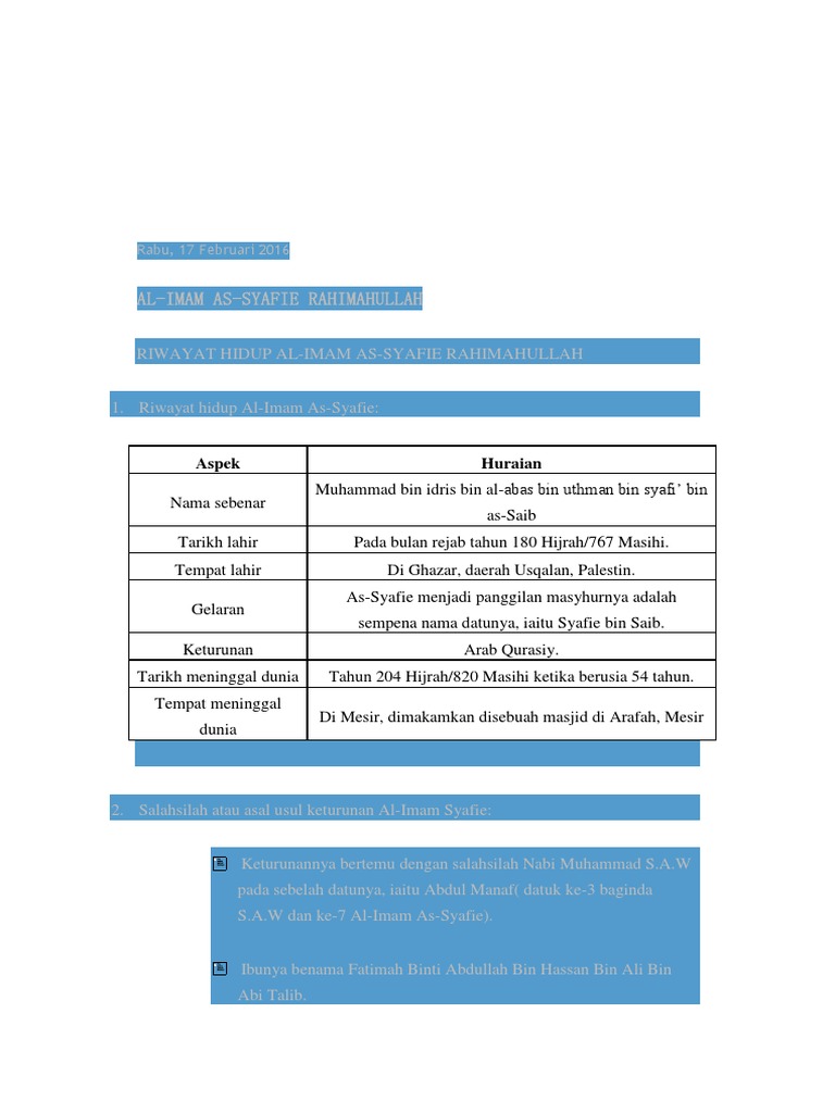 Riwayat Hidup Imam Syafie Pdf Txt from html.pdfcookie.com Imam syafii kemudian merumuskan aliran atau mazhabnya sendiri, yang dapat dikatakan berada di antara kedua kelompok tersebut. Para pemimpin dan ulama juga tidak lepas dari kata bijak. Ibu beliau adalah seorang wanita mulia dari kabilah azd (salah satu kabilah. Imam syafii lahir dari rahim seorang ibu yang salehah, serta dari ayah yang terkenal kesabaran dan. Pendiri mazhab maliki adalah imam malik. Nama terakhir adalah kakek dari rasulullah. Sebenarnya ketika tuanku menanyakan hal tersebut kepadaku, aku tidak mempunyai jawabannya. Ya syeikh, seandainya seekor burung tidak keluar dari sangkarnya, bagaimana mungkin ia akan mendapatkan rezeki? kata imam syafii.