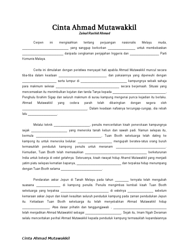 Cerpen Cinta Ahmad Mutawakkil from www.sistemguruonline.my Seperti penduduk kampung yang lain, ahmad mutawakkil sentiasa tabah dan sabar ketika menghadapi kesusahan hidup semasa penjajahan jepun dan keganasan komunis. ( zainal rashid ahmad ). Nilai pertama dalam cerpen cinta ahmad mutawakkilialah cinta akan negara.contohnya,ahmad mutawakkil menunjukkan rasa cinta akan negara dengan berjuang menentang inggeris dan bergiat dalam perjuangan menuntut kemerdekaan.sebagai wartawan. Judul cerpen yang digunakan menarik perhatian pembaca tentang apakah atau siapakah cinta sebenar pemuda bernama ahmad mutawakkil itu. Ahmad mutawakkil yang merupakan watak utama dalam cerpen ini telah menzahirkan cintanya terhadap bangsa dan negara melalui perjuangan menentang penjajah inggeris, jepun dan komunis. Ahmad mutawakkil yang merupakan watak utama dalam cerpen ini telah menzahirkan cintanya terhadap bangsa dan negara melalui contoh: Cerpen cinta ahmad mutawakkil ( zainal rasyid ahmad) telah menggunakan pendekatan sorot balik tentang kisah perjuangan ahmad mutawakkil dalam menzahirkan cintanya terhadap bangsa dan negara. Cerpen cinta ahmad mutawakkil disediakan sebagai game of learning.