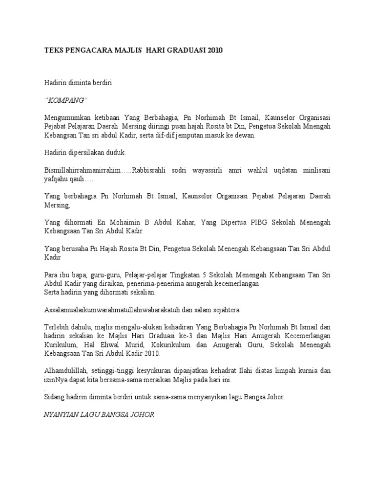 Kami telah beroperasi sejak tahun 2007 dan merupakan antara perniagaan melayu bumiputera yang masih kekal relevan walaupun begitu banyak persaingan yang wujud. Savesave teks pengacara majlis graduasi tahun 6 2012 for later. Teks pengacara majlis graduasi 2014. Juga sesuai diubahsuai untuk program sambutan lain dan juga peringkat daerah serta. Tentatif program viewpengerusi memaklumkan kepada ajk protokol supaya menyediakan aturcara pentadbiran dan teks pengacara majlis bagi kegunaan pada hari kejadian.